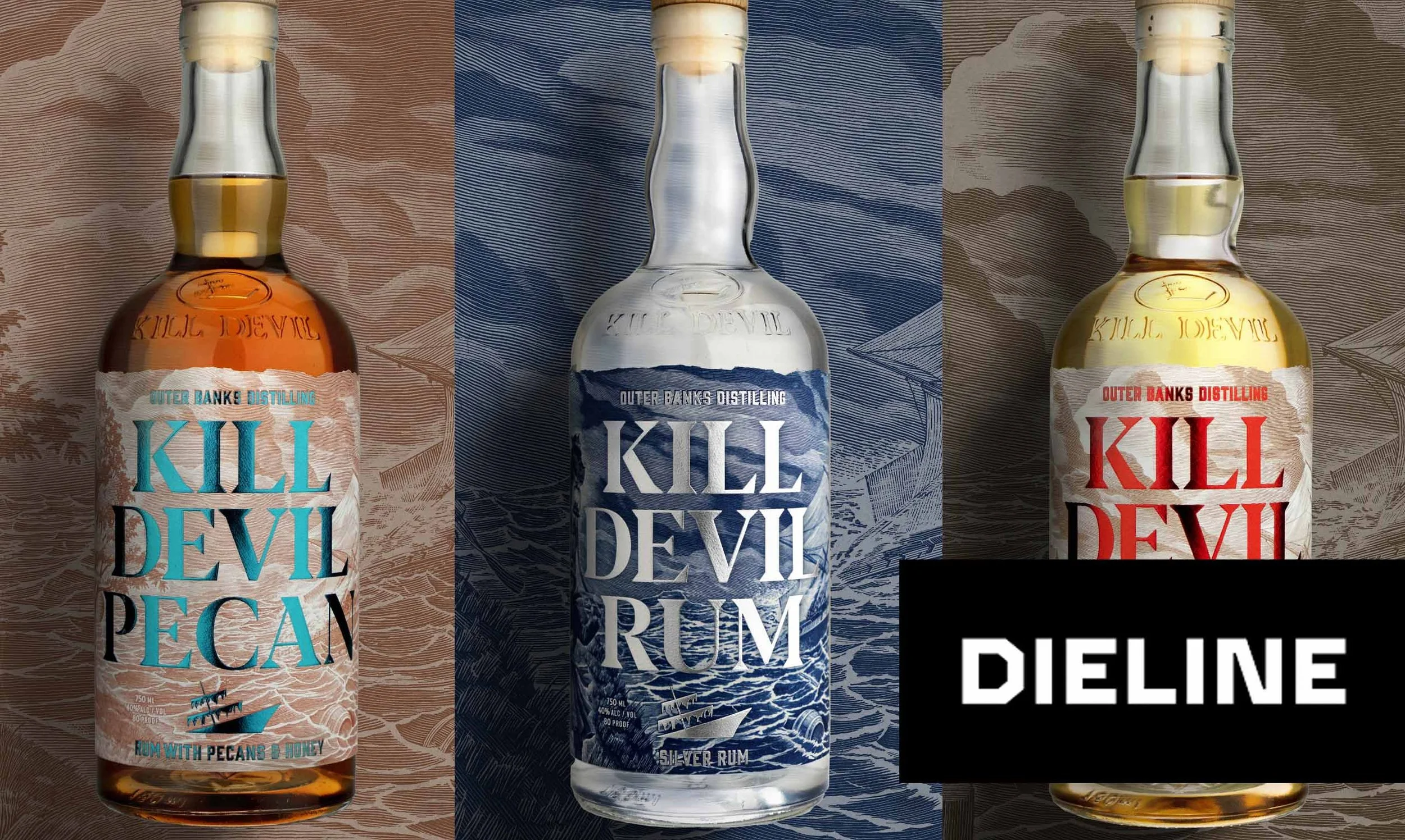 Outer Banks Distilling’s Kill Devil Rum packaging, designed by Creature Theory, leans into its coastal roots through layered textures and foiled typography. The oversized, serif-heavy lettering commands attention, sitting against an intricate backdrop of illustrated ocean waves.